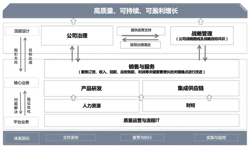 所以,汇川通过引入传世智慧的外力来推动企业内部的熵减。成立了专门的变革组织来支撑变革运作,开车的开车,修路的修路,从顶层设计包括治理(组织、权力、格局)、战略和业务设计,到升级营销和研发推动客户价值创造,再到人力资源、财经、数字化等后台的建设,把业务的改进和业务的能力紧紧结合了起来。